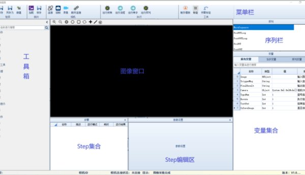 主界面包括菜单栏、图像窗口、工具箱、序列栏、变量集合、Step集合、Step编辑区七个模块