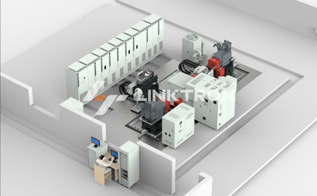 配置有两台高速驱动端,最高转速均为20000rpm,额定扭矩530Nm,加载电机功率可定制,配置环境仓,温控系统、电池模拟器及功率分析仪,主要满足混合动力变速器的开发测试,同时满足新能源减速器、新能源电机、及新能源动力总成的开发测试,包括疲劳寿命试验、效率试验、高温性能试验、低温启动试验、动态耐久试验、动态密封性试验、差速可靠性试验、标定匹配试验、模式试验、标准工况(NEDC、WLTC等)试验、自定义循环工况试验等。